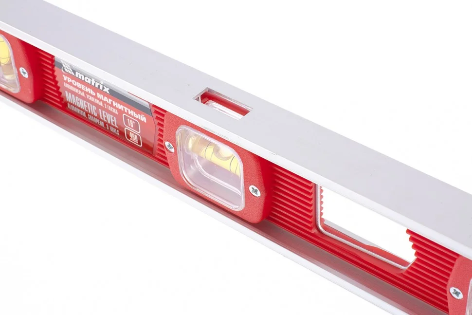 Магнитный уровень Matrix 33701 длиной 460 мм — это измерительный инструмент с 3 глазками для проверки горизонтальных и вертикальных поверхностей. Пригодится на строительной площадке или в быту при выравнивании поверхностей, монтаже конструкций, отделке помещений и других операциях. Погрешность не превышает 1 мм на каждый метр (0,057 градуса).Для определения отклонения вертикали 90 градусов необходимо использовать пузырьковую ампулу только в верхнем положении уровня. Только базовая поверхность является рабочей (противоположная ампуле 180 градусов).ПреимуществаКорпус инструмента выполнен из прочной пластмассы и легкого, но прочного алюминиевого каркаса.Благодаря магнитным свойствам уровень можно зафиксировать на металлических поверхностях, это повышает удобство работы.Для надежного удержания инструмента предусмотрено отверстие в корпусе.Пластиковые заглушки закрывают не допускают попадания пыли и мелкого мусора в корпус.