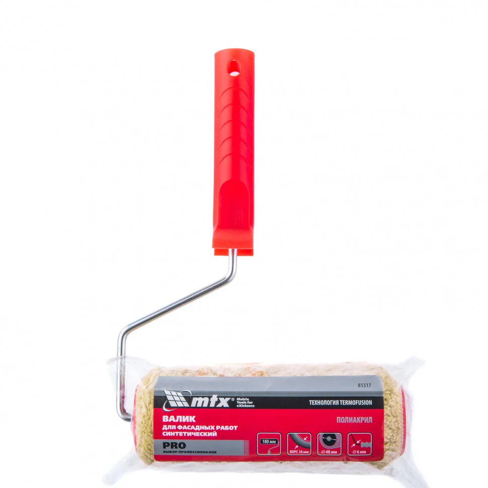 Синтетический валик для фасадных работ MTX PRO 81317 шириной 180 мм, диаметром 48 мм, с ворсом 18 мм и диаметром ручки 6 мм хорошо прокрашивает рельефные поверхности. Им удобно обрабатывать участки большой площади, валик рекомендуется для работ по бетону, кирпичу, металлу, древесине, штукатурке.ПреимуществаРавномерное окрашивание — полиакриловая шубка обладает хорошей формостойкостью и высокими краскообменными качествами.Долгий срок службы — волокна полиакрила устойчивы к износу.Возможность использования для любых общемалярных работ — валик совместим со всеми типами лакокрасочных материалов.Долговечность — наклеенная термическим способом шубка не оторвется при многократном применении.Максимальная отдача краски на поверхность — ролик свободно вращается на бюгеле.Высокое качество окрашивания — бесшовная шубка с обработанными краями не оставляет следов.Прочность — бюгель оцинкован, поэтому не подвержен образованию коррозии.Быстросъемная конструкция — замена валика занимает несколько секунд.Гарантированная надежность — валик изготовлен на современном производстве с использованием новейших материалов, а также прошел многоступенчатый контроль качества.