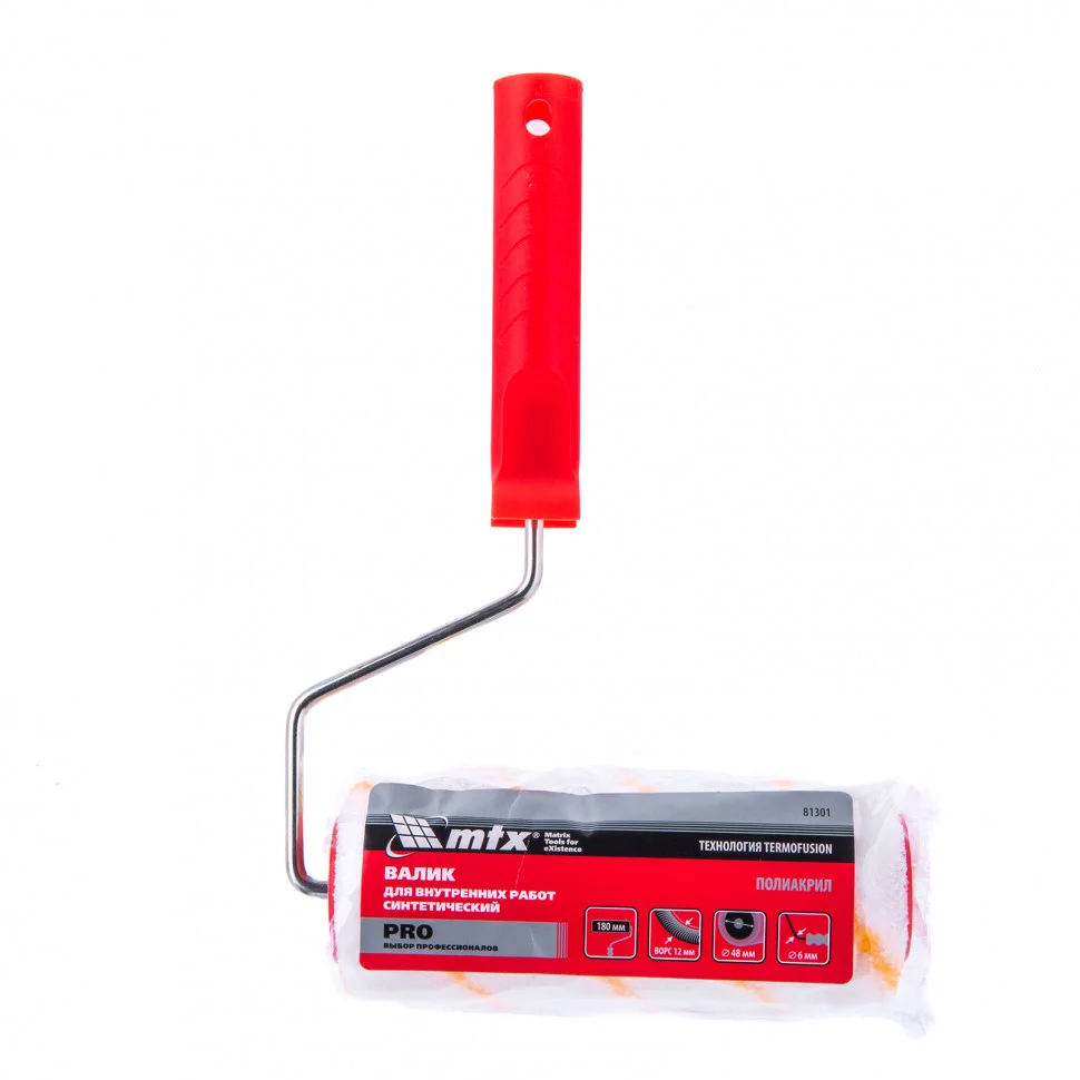 Синтетический валик для внутренних работ MTX PRO 81301 с ворсом из полиакрила 12 мм, шириной ролика 180 мм, диаметром 48 мм, ручкой 6 мм, предназначен для окрашивания больших площадей. Он позволяет окрашивать среднегладкие и шероховатые участки — стены, потолки, деревянные поверхности.ПреимуществаУниверсальность — валик с полиакриловой шубкой подходит для всех видов лакокрасочных материалов.Долгий срок службы — волокна полиакрила устойчивы к износу.Равномерное прокрашивание неровностей — полиакриловая шубка обладает хорошей формостойкостью.Окрашивание без следов и выпавших волосков — у шубки нет шва, ворс вычесан, а края обработаны.Максимальная отдача ЛКМ на поверхность — валик вращается свободно и не заедает.Защита от отслаивания и деформации — шубка надежно зафиксирована на ролике с использованием технологии Termofusion.Быстросъемная конструкция — замена рабочей части валика производится очень легко, также это позволяет чистить валик без бюгеля.Коррозионная стойкость — оцинкованный бюгель защищен от разрушения, имеет долгий срок службы.Высокое качество — валик произведен на современном оборудовании из новейших материалов.