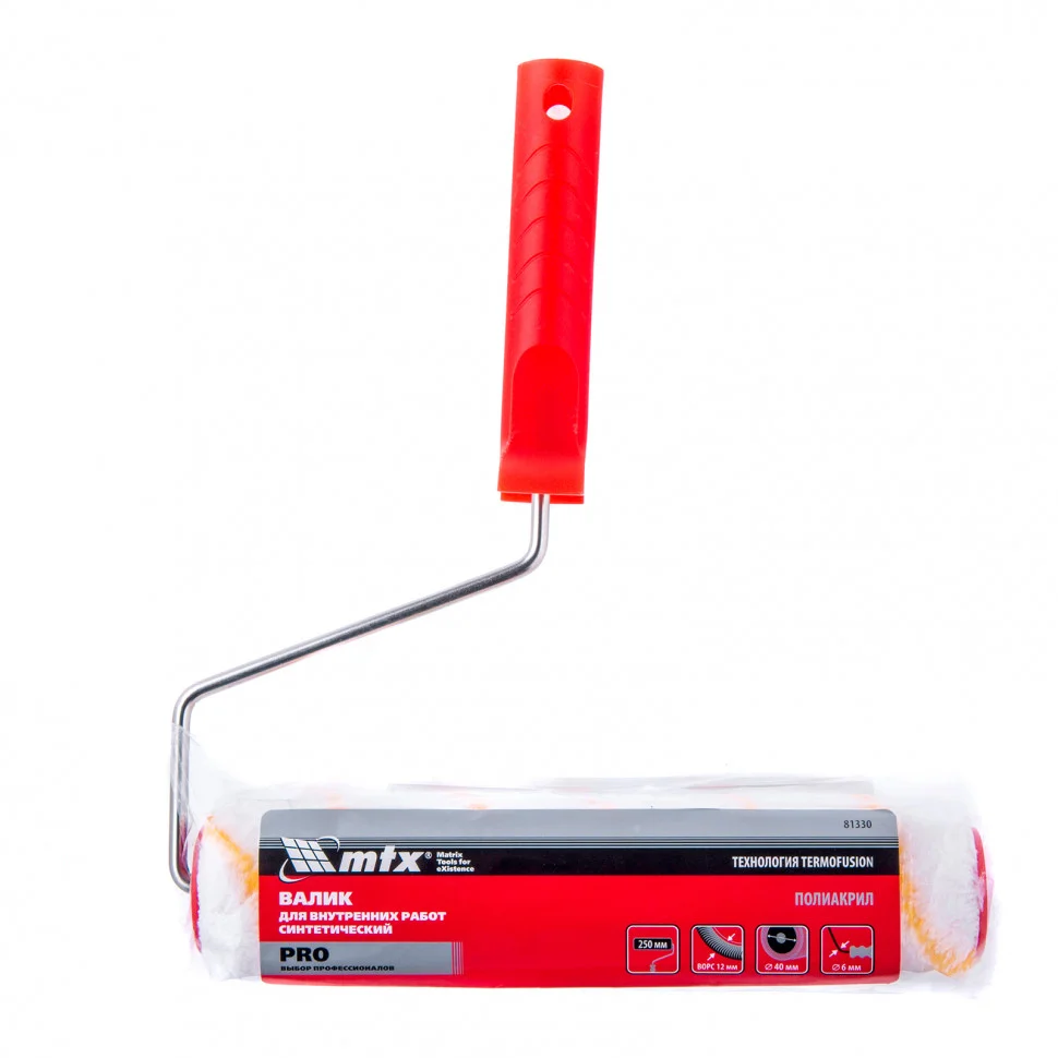 Синтетический валик для внутренних работ MTX PRO 81330 с ворсом из полиакрила 12 мм, шириной ролика 250 мм, диаметром 40 мм, ручкой 6 мм, предназначен для окрашивания больших площадей. Он позволяет окрашивать среднегладкие и шероховатые участки — стены, потолки, деревянные поверхности.ПреимуществаУниверсальность — валик с полиакриловой шубкой подходит для всех видов лакокрасочных материалов.Долгий срок службы — волокна полиакрила устойчивы к износу.Равномерное прокрашивание неровностей — полиакриловая шубка обладает хорошей формостойкостью.Окрашивание без следов и выпавших волосков — у шубки нет шва, ворс вычесан, а края обработаны.Максимальная отдача ЛКМ на поверхность — валик вращается свободно и не заедает.Защита от отслаивания и деформации — шубка надежно зафиксирована на ролике с использованием технологии Termofusion.Быстросъемная конструкция — замена рабочей части валика производится очень легко, также это позволяет чистить валик без бюгеля.Коррозионная стойкость — оцинкованный бюгель защищен от разрушения, имеет долгий срок службы.Высокое качество — валик произведен на современном оборудовании из новейших материалов.