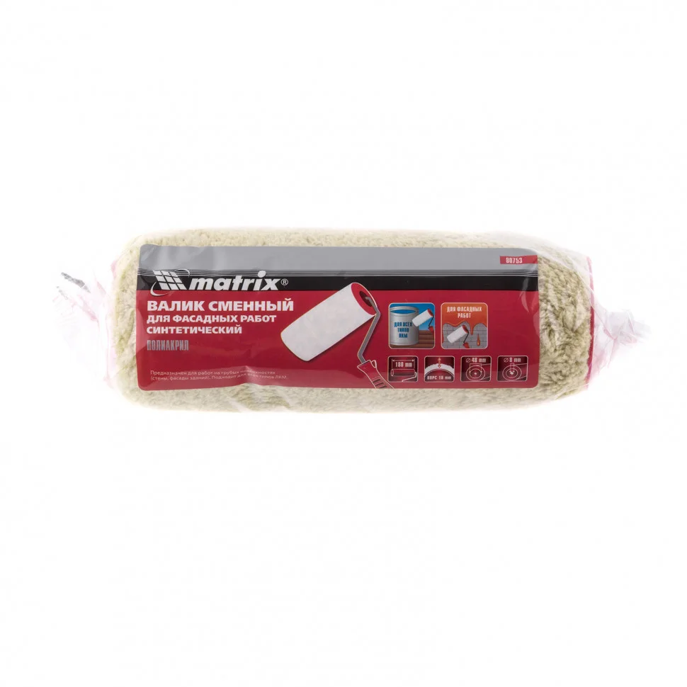 Синтетический сменный валик для фасадных работ Matrix 80753 с ворсом 18 мм из полиакрила, шириной 180 мм и диаметром 48 мм, устанавливается на бюгель 8 мм. Шубка с длинным ворсом полностью прокрашивает неровные поверхности с грубой фактурой: древесину, оштукатуренные стены, гофрированный металл, бетон и кирпич, внешние стены зданий и т.д. Полиакрил в составе шубки позволяет применять валик с любыми типами ЛКМ.ПреимуществаВысокий ресурс — полиакриловая шубка хорошо держит форму и не боится разрывных нагрузок.Продуманная конструкция — свободно вращающийся ролик обеспечивает максимальную отдачу краски на окрашиваемую поверхность.Легкая установка — благодаря быстросъемной системе валик крепится к бюгелю за несколько секунд.Устойчивость к интенсивным нагрузкам — шубка не деформируется, т.к. надежно приклеена на ролик с использованием технологии Termofusion.Равномерное нанесение краски без полос и следов — на шубке нет шва, а ее края острижены.Быстрое окрашивание поверхностей большой площади — валик имеет ширину 180 мм и диаметр 48 мм.