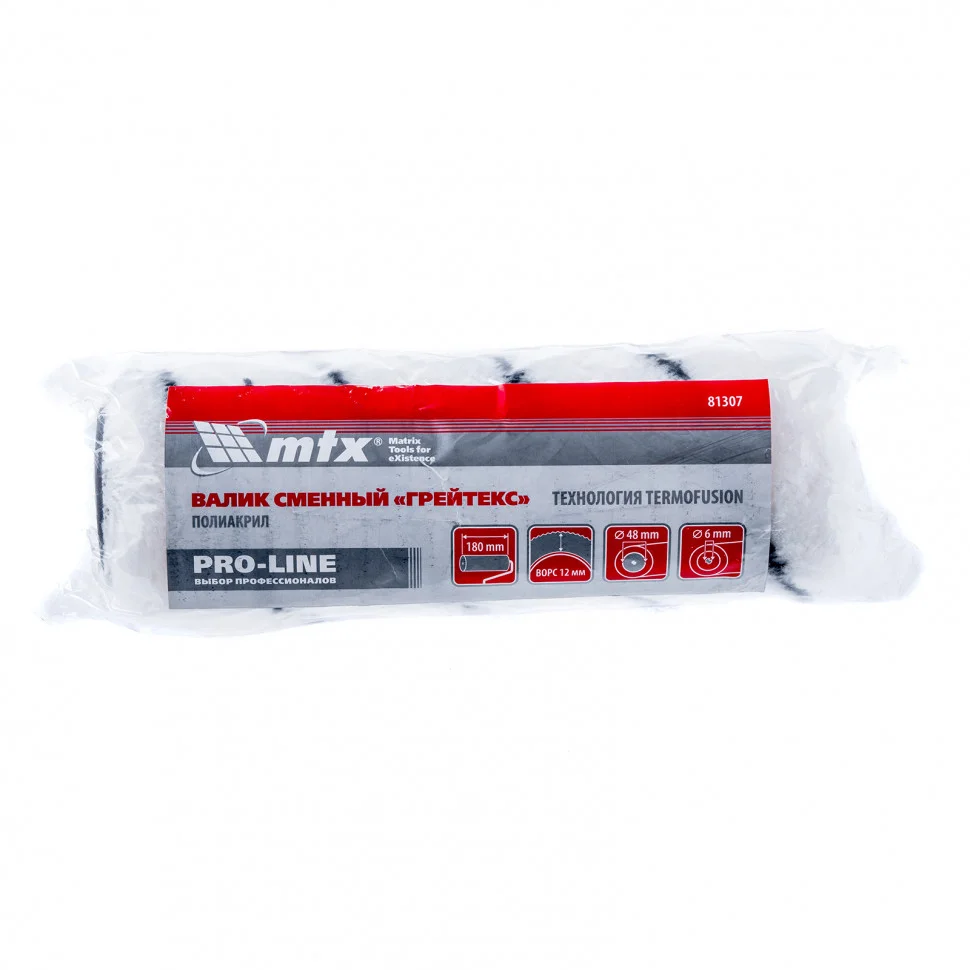 Валик сменный MTX PRO LINE «ГРЕЙТЕКС» 81307 с ворсом из полиакрила 12 мм, диаметром ролика 48 мм и шириной 180 мм устанавливается на ручку 6 мм. Валиком удобно обрабатывать большие поверхности, поэтому он используется для подготовки больших участков под покраску и окрашивания стен и потолков. Ворс 12 мм позволяет качественно окрашивать среднешероховатые поверхности.ПреимуществаСовместимость со всеми типами лакокрасочных материалов расширяет возможности применения валика.Ворс из полиакрила обладает хорошей формостойкостью, поэтому валик равномерно распределяет лакокрасочный материал по поверхности.Шубка из полиакрила устойчива к износу, поэтому прослужит долго.Фиксация шубки по технологии Termofusion — шубка не отклеится при многократном использовании.Бесшовная структура шубки и обработанные края валика обеспечивают окрашивание без полос и прочих дефектов.Благодаря вычесанной шубке валик не ворсит на поверхности.Гарантированная надежность — валик изготовлен на современном производстве с использованием новейших материалов, а также прошел многоступенчатый контроль качества.