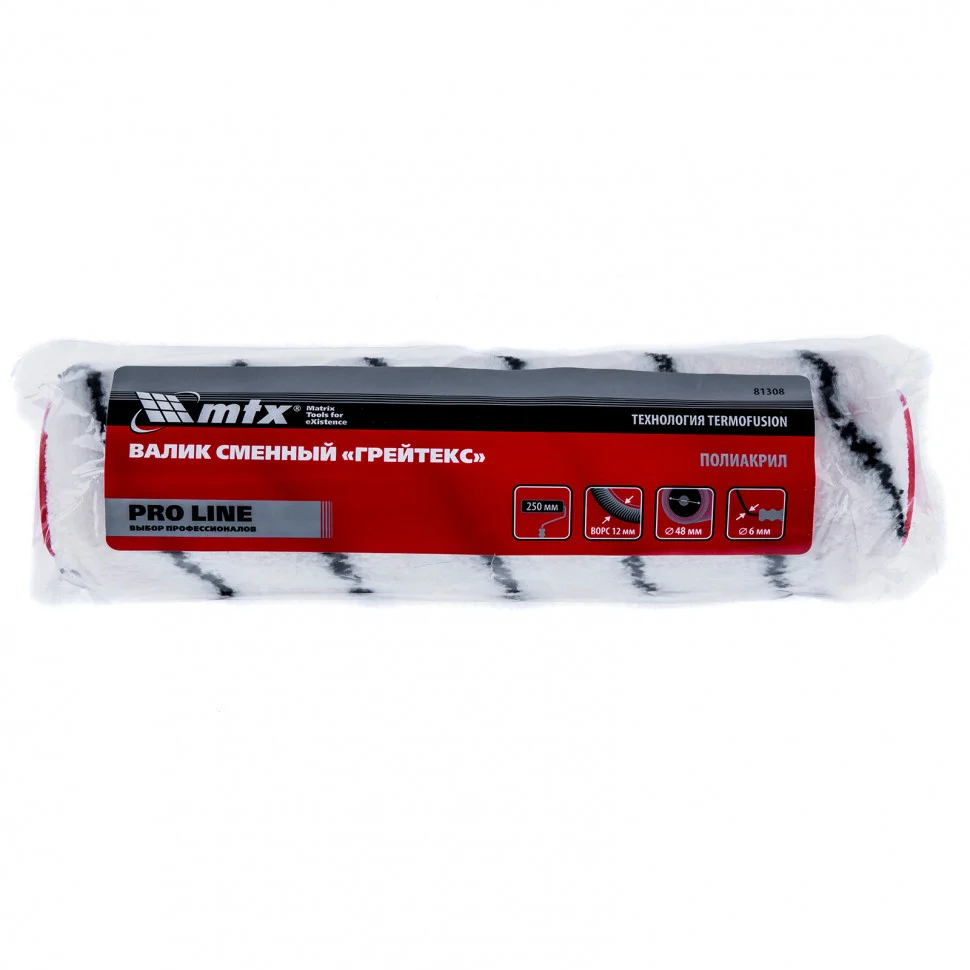 Валик сменный MTX PRO LINE «ГРЕЙТЕКС» 81308 с ворсом из полиакрила 12 мм, диаметром ролика 48 мм и шириной 250 мм устанавливается на ручку 6 мм. Валиком удобно обрабатывать большие поверхности, поэтому он используется для подготовки больших участков под покраску и окрашивания стен и потолков. Ворс 12 мм позволяет качественно окрашивать среднешероховатые поверхности.ПреимуществаСовместимость со всеми типами лакокрасочных материалов расширяет возможности применения валика.Ворс из полиакрила обладает хорошей формостойкостью, поэтому валик равномерно распределяет лакокрасочный материал по поверхности.Шубка из полиакрила устойчива к износу, поэтому прослужит долго.Фиксация шубки по технологии Termofusion — шубка не отклеится при многократном использовании.Бесшовная структура шубки и обработанные края валика обеспечивают окрашивание без полос и прочих дефектов.Благодаря вычесанной шубке валик не ворсит на поверхности.Гарантированная надежность — валик изготовлен на современном производстве с использованием новейших материалов, а также прошел многоступенчатый контроль качества.