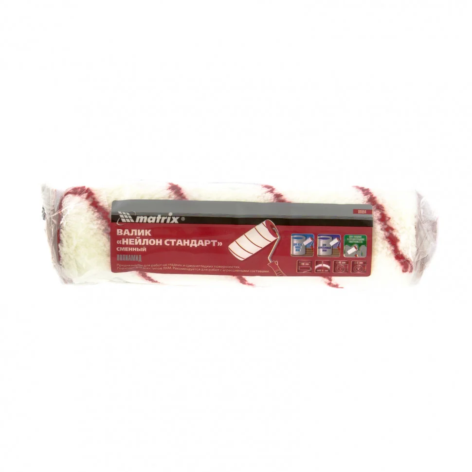 Сменный валик Matrix 80894 «Нейлон стандарт» с полиамидным ворсом длиной 9 мм и диаметром ролика 36 мм подходит к ручкам диаметром 6 мм. Он предназначен для нанесения любых типов лакокрасочных материалов на гладкие и средне-гладкие поверхности. Ширина 180 мм позволяет эффективно и быстро окрашивать большие площади: стены, потолки, фасады и т.д.ПреимуществаПолиамидная шубка обладает наилучшей формостойкостью, износостойкостью и краскообменными свойствами, поэтому максимально эффективно окрашивает даже неровные поверхности.Ворс из полиамида особенно устойчив к разрывным нагрузкам, не осыпается и надолго сохраняет высокие эксплуатационные свойства.Свободное вращение ролика в сочетании с высококачественным ворсом обеспечивают максимальную отдачу ЛКМ на окрашиваемую поверхность и снижают расход материалов.Благодаря быстросъемной конструкции валик легко демонтируется с бюгеля для промывки и замены.Шубка приклеена к ролику по технологии Termofusion, поэтому она защищена от деформации и отслаивания, в том числе при длительном использовании.Бесшовная структура шубки и обработанные края ролика позволяют наносить краску аккуратно, без следов и полос.