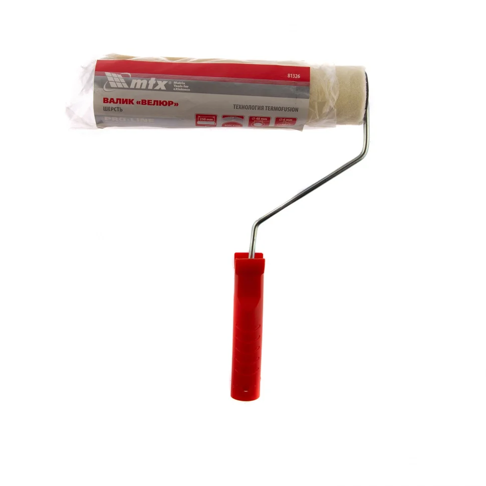 Валик MTX PRO «ВЕЛЮР» 81326 шириной 250 мм с ворсом 4 мм из шерсти 50% и полиакрила 50%, диаметром ролика 48 мм и ручкой 6 мм используется при проведении финишной отделки. Благодаря короткому ворсу лакокрасочный состав распределяется тонким слоем. Валик оптимален для работы с алкидными и эпоксидными лаками, но подходит также для нанесения тонким слоем других материалов, например, защитных составов на основе растворителей.ПреимуществаБлагодаря наличию шерсти в составе шубка хорошо удерживает и отдает краску, обеспечивая высокие краскообменные качества.Полиакрил обладает износостойкостью, поэтому валик подходит для многократного применения.Шубку с быстросъемным роликом можно легко заменить, а также очистить без бюгеля.Шубка наклеена термическим способом, поэтому не сползает с ролика и не деформируется при интенсивном использовании.Бесшовная шубка с обработанными краями и вычесанным ворсом не оставляет полос на декоративном покрытии.Оцинкованный бюгель не ржавеет, это продлевает срок службы изделия.Свободное вращение ролика обеспечивает максимальную отдачу краски и равномерное распределение ее по поверхности.Пластиковая рукоятка снабжена специальными упорами — за счет этого она удобно ложится в руку, что снижает утомляемость при работе.Валик изготовлен на новейшем оборудовании с соблюдением современных технологий, что гарантирует его высокое качество.