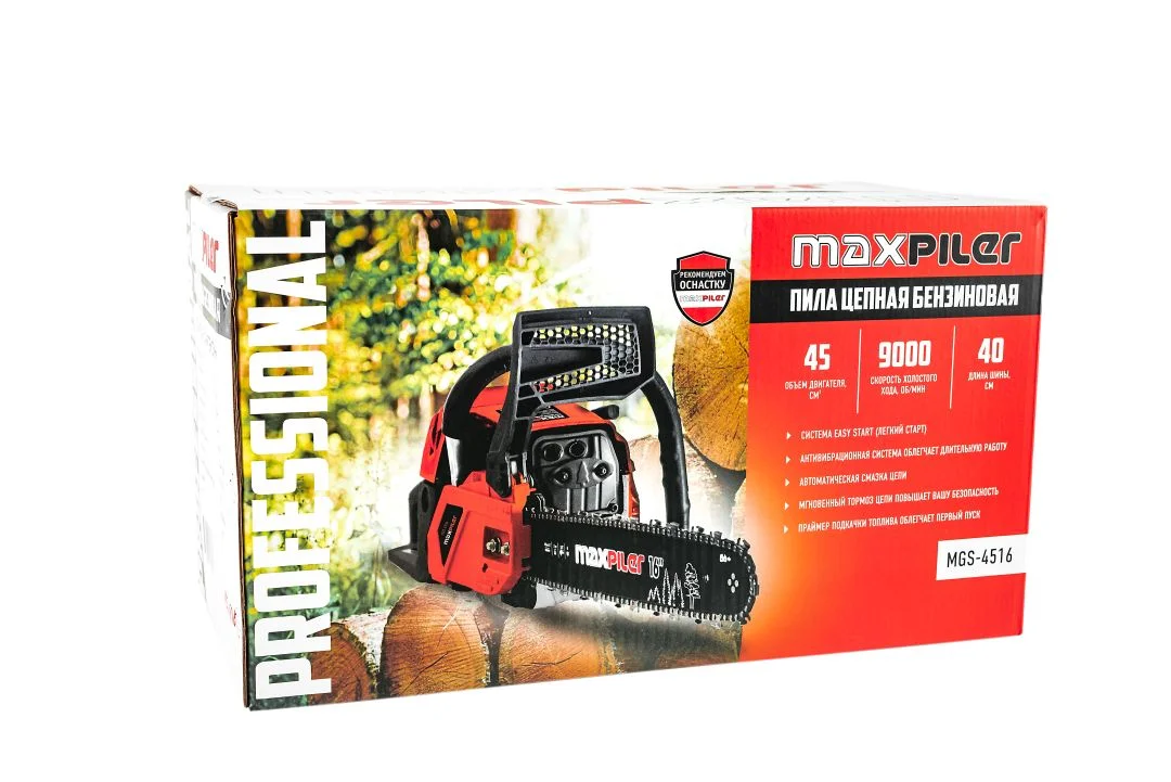 Бензопила MaxPiler MGS-4516 - отличный инструмент для работы в саду, на даче или в мастерской. Подходит для заготовки дров и пиломатериалов. Система “Легкий старт” обеспечивает быстрый запуск двигателя без лишних усилий, а надежный и мощный бензиновый двигатель - производительную работу. Пила прослужит долго, благодаря качественным комплектующим, в том числе хромированному цилиндру.