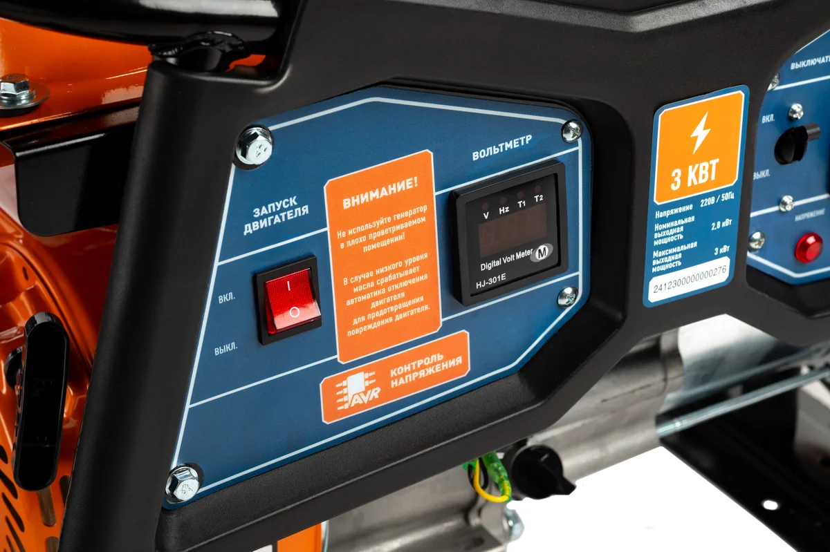 Генератор бензиновый MPG-3000A используется для электропитания приборов с общей потребляемой мощностью до 3 кВт в местах с отсутствием стационарной электросети. Предусмотрена индикация уровня масла и топлива для своевременной дозаправки устройства. При коротком замыкании, подача тока отключается автоматически. Металлическая рама защищает внутренние элементы от ударов