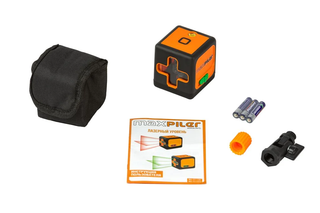 Коробка, уровень лазерный, сумка тканевая, элементы питания ААА (3шт), переходник 1/5-5/8", адаптер для построения наклонных линий, руководство по эксплуатации