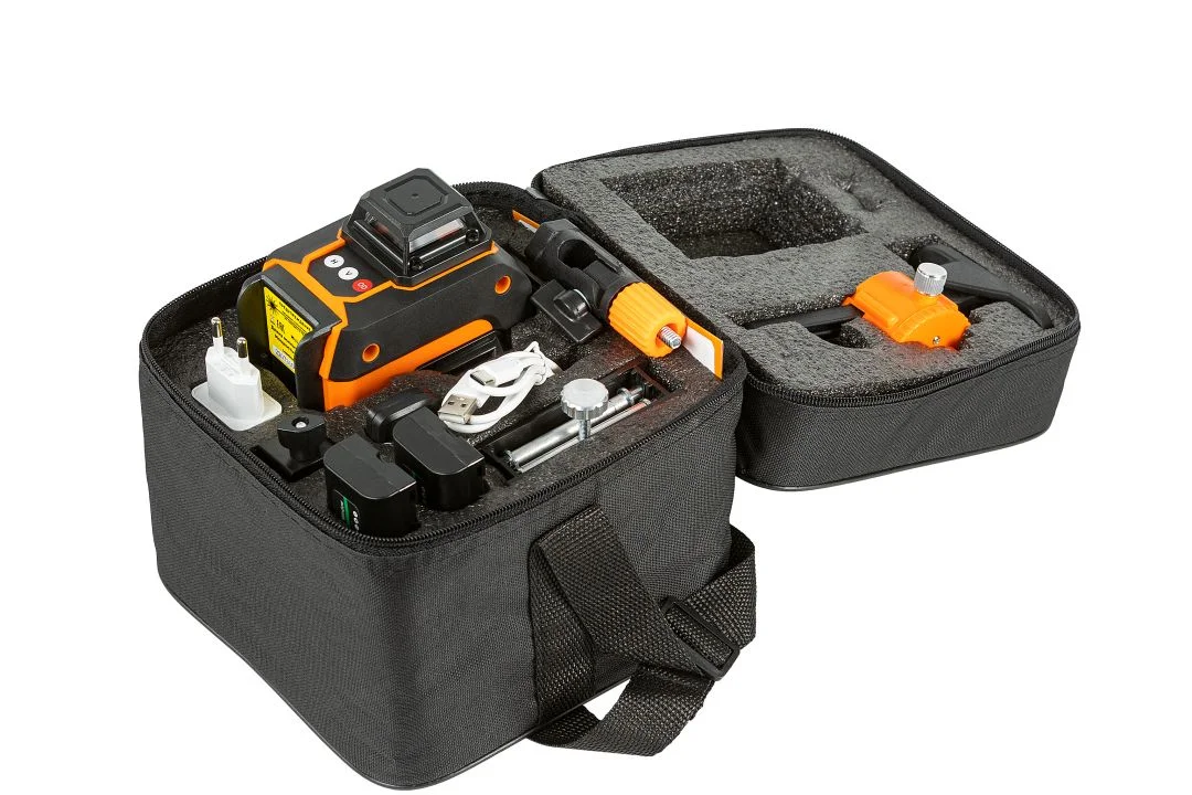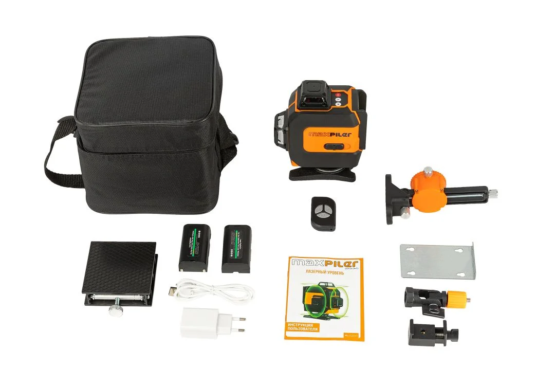 Лазерный уровень, тканевая сумка, аккумуляторная батарея (2 шт.), зарядное устройство, пульт управления, подставка с подъемным механизмом, комплект с магнитным держателем для подвешивания уровня, переходник 1/4-5/8", адаптер для построения наклонных линий, руководство по эксплуатации, картонная упаковка