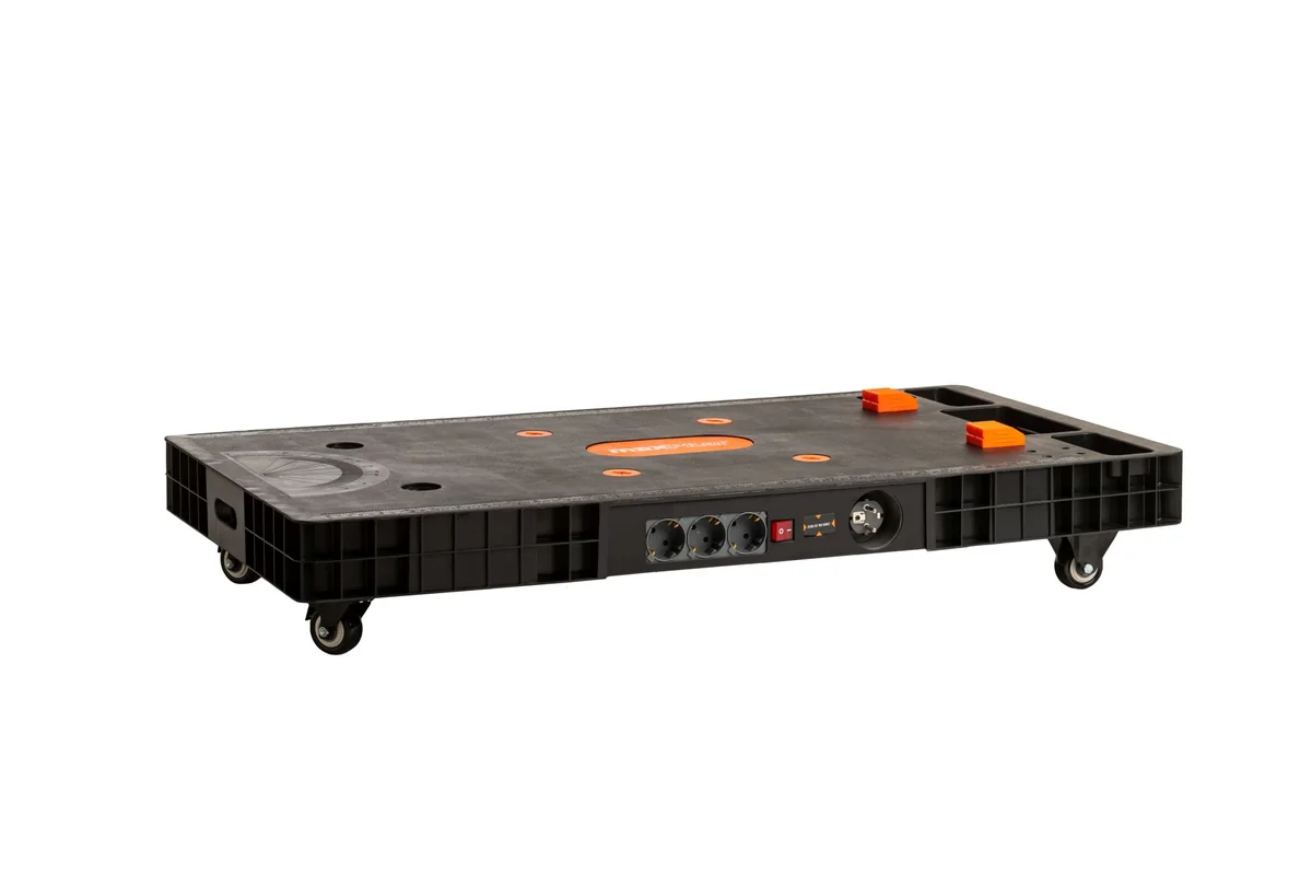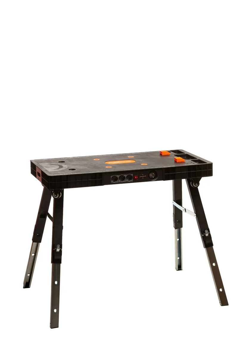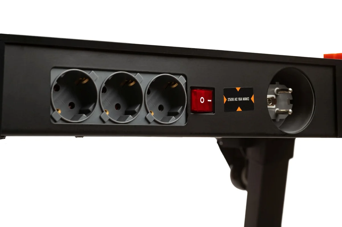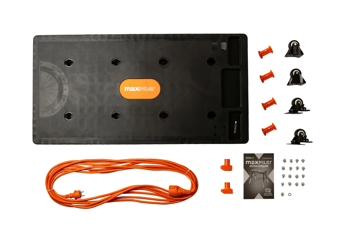 Верстак, ролик поворотный (2 шт.), ролик фиксированный (2 шт.), упор пластиковый (2 шт.), соединитель быстроразъемный (4 шт.), блок розеток, удлинитель, руководство по эксплуатации, коробка