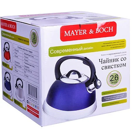 Чайник MAYER&BOCH изготовлен из высококачественной нержавеющей стали. Изделия из нержавеющей стали не окисляются и не впитывают запахи, благодаря чему вы всегда получите натуральный, насыщенный вкус и аромат напитков. Капсулированное дно с прослойкой из алюминия обеспечивает наилучшее распределение тепла. Фиксированная эргономичная ручка выполнена из бакелита, также на ручке расположена клавиша механизма открывания носика. Носик чайника оснащен насадкой-свистком, который позволяет контролировать процесс кипячения или подогрева воды. Поверхность чайника гладкая, что облегчает уход за ним. Эстетичный и функциональный, с современным дизайном, чайник будет замечательно смотреться на любой кухне. Подходит для использования на всех типах плит, включая индукционные. Подходит для мытья в посудомоечной машине.