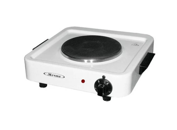 Современная компактная электроплита Мечта 111Ч принадлежит к категории одноконфорочных переносных плиток. Благодаря своим скромным размерам и небольшому весу (а это 315х300х55 мм и 3,7 кг соответственно) она не занимает много места ни при хранении, ни при транспортировке. Все это делает ее отличным выбором в качестве дополнительного приспособления для приготовления пищи на кухне квартиры, на даче и даже в поездке. У плиты есть всего одна конфорка вида «чугунный блин» – она медленно нагревается, но также медленно и остывает, позволяя блюду доходить до нужно состояния уже после того, как плитка будет отключена от электросети. Мощность плитки Мечта составляет 1000 Вт, нагревательный элемент чугунная конфорка. Управляется плита при помощи одного поворотного переключателя – он позволяет выбирать интенсивность нагрева. Также на корпусе присутствует индикатор работы настольной плитки и две ручки, которые упрощают ее переноску. Плита выпускается в двух цветовых решениях – черном и белом, покрытием выступает прочная и простая в уходе эмаль. На поверхности плитка надежно удерживается благодаря четырем ножка с вкладышами, исключающими скольжение.