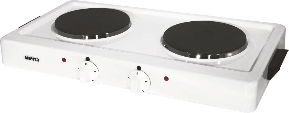 Компактная и недорогая электроплитка Мечта 211Ч – настоящая находка в тех ситуациях, когда обзаводиться крупными приборами для приготовления пищи либо нет технической возможности, либо нецелесообразно. Она станет одинаково полезной на даче, на съемной квартире, на маленькой кухне, где нет обычной газовой плиты. Кроме того, благодаря скромному весу (всего 5 кг), ее легко можно переносить с места на место. Плита Мечта 211Ч на своей поверхности содержит две равновеликие конфорки. Это классические чугунные «блины», мощность их работы абсолютно одинаковая и составляет ровно по 1000 Вт. Соответственно, суммарная потребляемая плиткой мощность не превышает 2000 Вт. Электроплита настольная Мечта 211Ч выполнена в белом цвете, в качестве покрытия используется современная стеклоэмаль – стойкая к повреждениям и простая в очистке, что позволит надолго сохранить ее в первоначальном виде. На торец вынесены два переключателя поворотного типа, которые позволяют выбирать интенсивность нагрева под каждый конкретный случай. О работающих конфорках дополнительно оповещают два индикатора. На поверхности плитке помогают удерживаться прорезиненные ножки, обладающие противоскользящим эффектом.