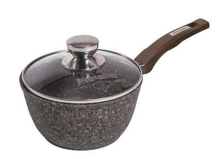 Ковш 1.2л. с несъемной ручкой из бакелита и стеклянной крышкой. Антипригарное покрытие Greblon на водной основе без PFOA. Серия "Premium" (mokko). Подходит для всех типов плит, кроме индукционных. Можно использовать в посудомоечной машине. Ресурс более 15 000 циклов, толщина покрытия до 60 мкр. Толщина дна 5,56мм., толщина стенок 3,64мм. Покрытие Greblon позволяет готовить с минимальным количеством масла, сохраняя вкусовые и полезные свойства продуктов. Литой толстостенный корпус не подвержен деформации, а утолщенное дно равномерно распределяет тепло по всей поверхности.