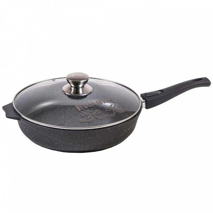 - Сковорода из литого толстостенного алюминия со съемной ручкой и стеклянной крышкой, с антипригарным покрытием повышенной стойкости