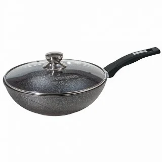 - Сковорода-вок из литого высококачественного пищевого алюминия с антипригарным покрытием с несъемной ручкой и стеклянной крышкой
