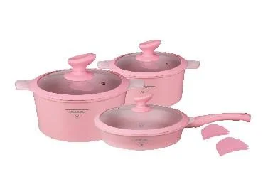 Материал: высококачественный литой алюминий. Антипригарное покрытие non-stick под мрамор. Ручки с покрытием Soft Touch. Кастрюля с крышкой 7,3 л (28*14 см). Кастрюля с крышкой 2,7 л (20*10,3 см). Сковорода с крышкой 2,6 л (28*5,5 см). Съемные силиконовые накладки - 4 шт. Крышки из термостойкого стекла с силиконовым ободом и паровыпуском. Устойчивость к температуре от -20*С до + 220*С. Можно мыть в посудомоечной машине. Подходит для всех видов плит, включая индукцию.