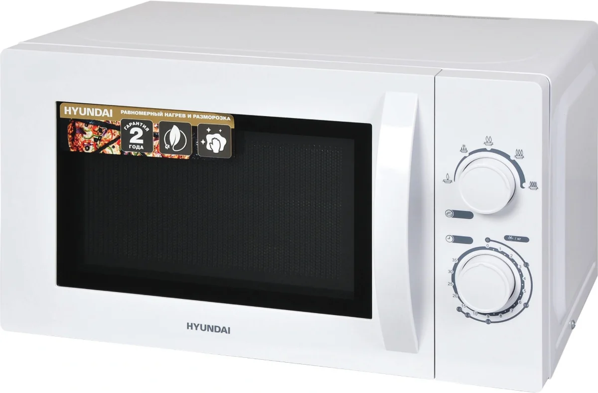 Микроволновая печь Hyundai HYM-M2059 объёмом 20 литров и мощностью микроволн 700 Вт имеет белый корпус.