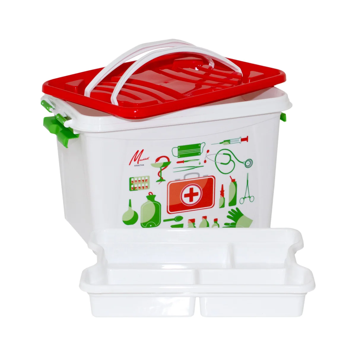 Аптечка станет незаменимым спутником как дома, так и в поездках. Изделие выполнено из не прозрачного пластика, а значит защищает содержимое от попадания солнечных лучей, что можно отнести к плюсам, вкладыш позволяет удобно организовать пространство внутри и хранить содержимое в порядке. Контейнер плотно закрывается крышкой с защелками, защищая от проникновения пыли, с помощью ручек легко переносится, очень вместителен и поможет вам хранить все медицинские препараты в одном месте. На крышке предусмотрены выемки для ручек, благодаря которой изделие занимает минимум места при хранении и транспортировке. Этикетка: IML итекетка/самоклейка