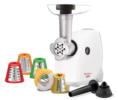 С помощью двух решеток из нержавеющей стали Вы легко сможете регулировать толщину нарезки мяса, а специальные насадки-овощерезки позволят нашинковать овощи на Ваш вкус, в том числе кубиками.