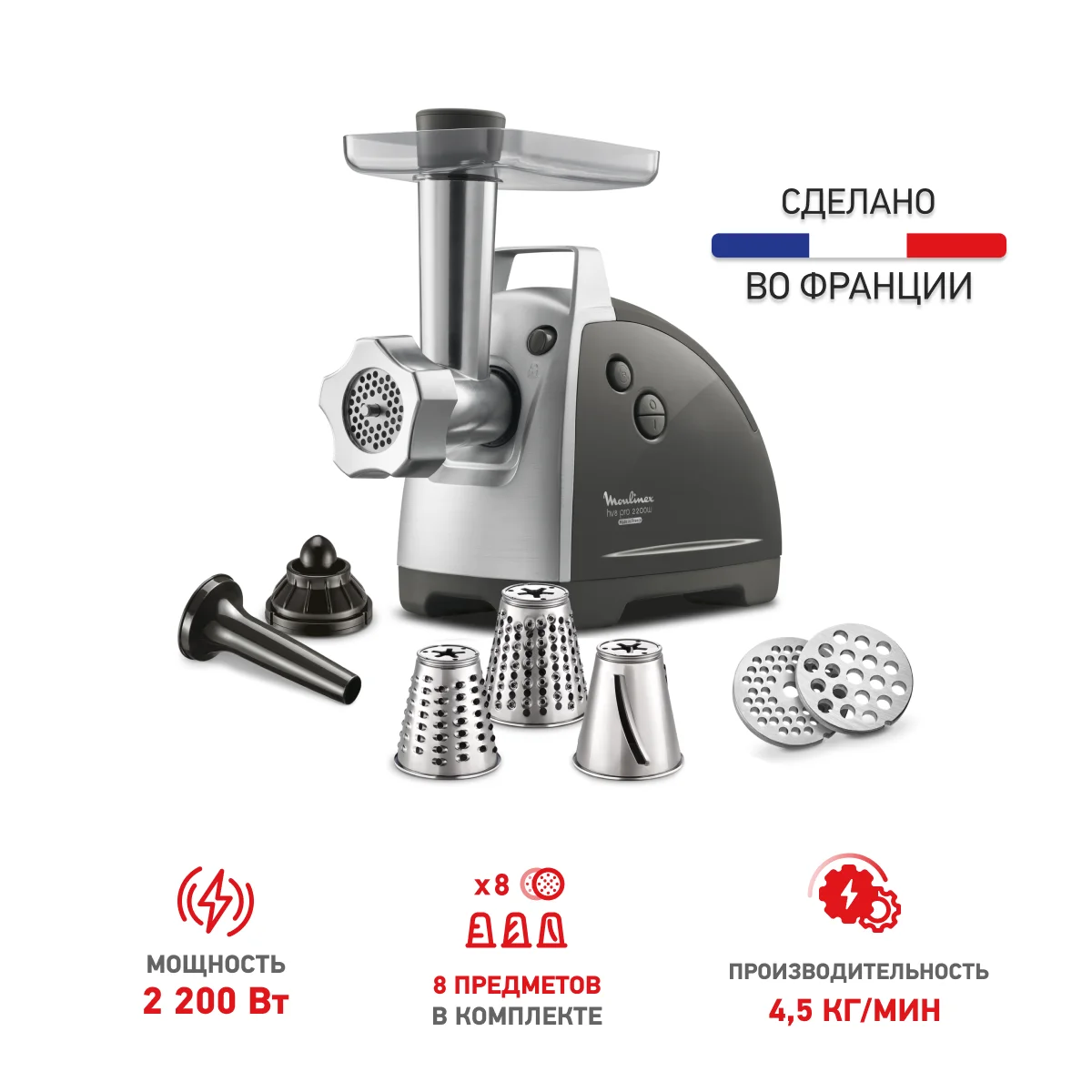 | Комплектация | 2 решетки, конусы: терка мелкая, терка для сыра, шинковка; для кеббе, толкатель |