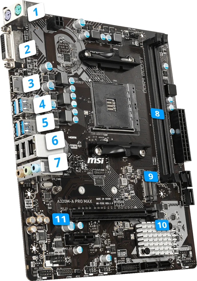 Материнская плата MSI A320M-A PRO MAX соответствует форм-фактору Micro-ATX. Модель подходит для сборки компьютера в компактном корпусе. Устройство базируется на чипсете AMD A320. Вы сможете сконструировать рабочую станцию универсального назначения. Такой компьютер может быть полезен в офисе и дома.