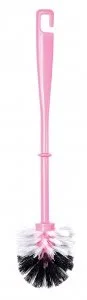 Ерш туалетный предназначен для уборки сантехнического изделия. Представляет собой пластиковую рукоятку с насадкой-щеткой из полиэтилена. Выполнен в бело-розовой гамме. Отличается удобством в работе. Верх рукоятки дополнительно оснащен крючком, так что при необходимости изделие можно хранить в подвешенном состоянии. Щетка сконструирована таким образом, что легко промывает труднодоступные участки унитаза. Не меняет цвет, не деформируется даже в ходе интенсивной эксплуатации.