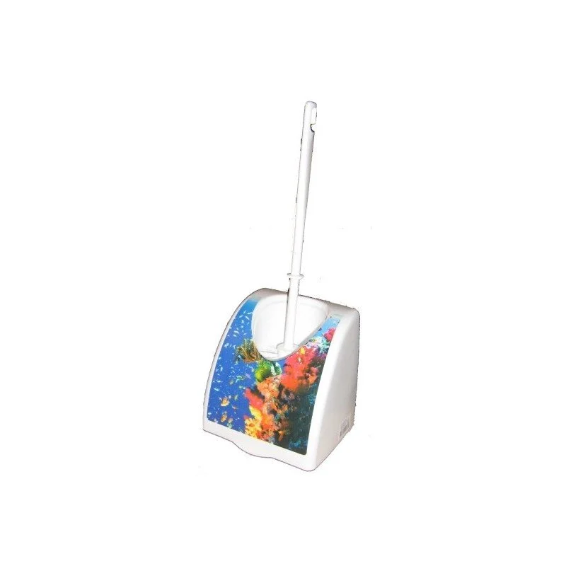 Универсальный ерш для чистки унитаза. Представляет собой конструкцию из непосредственно рукояти со щеткой и подстаканника. Цвет изделия — белый. Подстаканник декорирован наклейкой с экзотическим пейзажем.