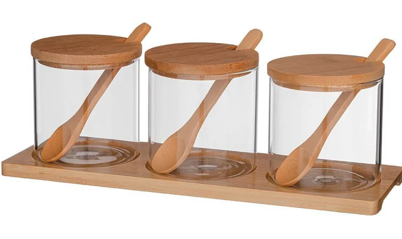 - Стеклянные ёмкости можно мыть в посудомоечной машине, а бамбуковые элементы (крышки, ложечки, подставку) рекомендуется очищать вручную в тёплой воде с мыльным раствором.