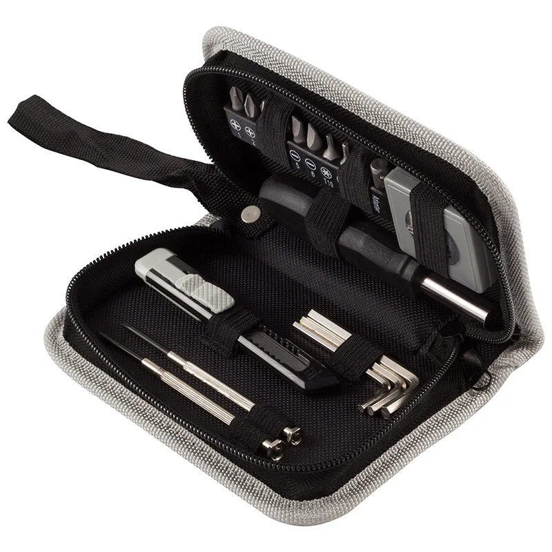 в наборе: - рукоятка-битодержатель - отвертка прецизионная SL2 - отвертка прецизионная PH00 - биты 25 мм 9 шт PH1,PH2,PZ1,PZ2,SL5,SL6,T10,T15,T20 - адаптер - нож технический 9 мм - рулетка 1 м - шестигранные ключи 3 шт - 3мм,4мм,5мм - чехол на молнии материалы: карбоновая сталь, полипропилен Упаковка: пленка. цветной рукав