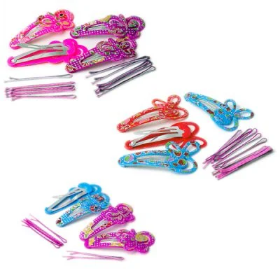 Размер (см): 5*2,5. Длина (см): 4,5. Цвета в ассортименте: принт-микс. Материал: металл, пластик. Комплектация (шт.): заколки-зажимы - 4; заколки-невидимки -10.
