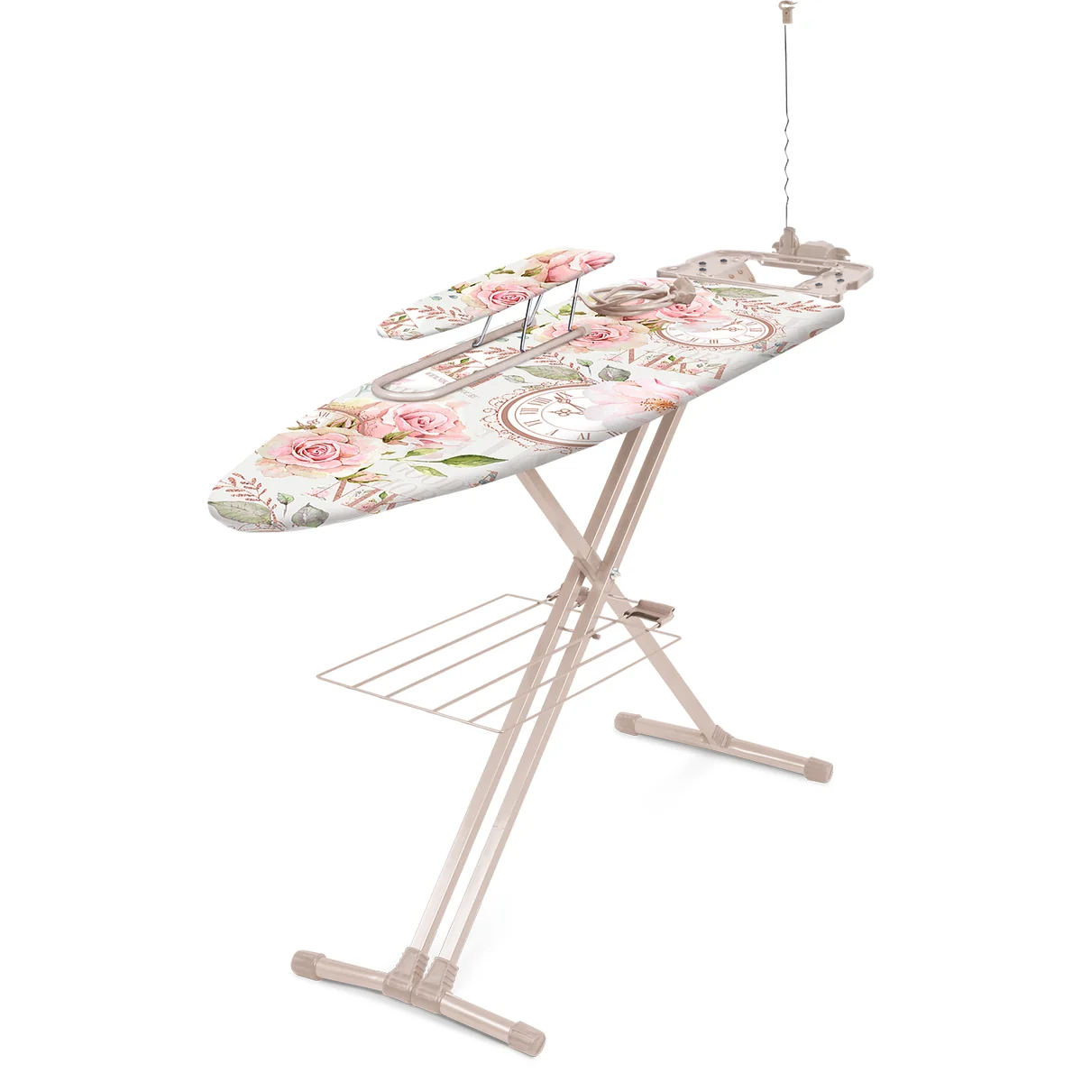 Гладильная доска с электросоединителем и подставкой под утюг, регулируемая по высоте. Удобная полка для белья и переносной подрукавник.