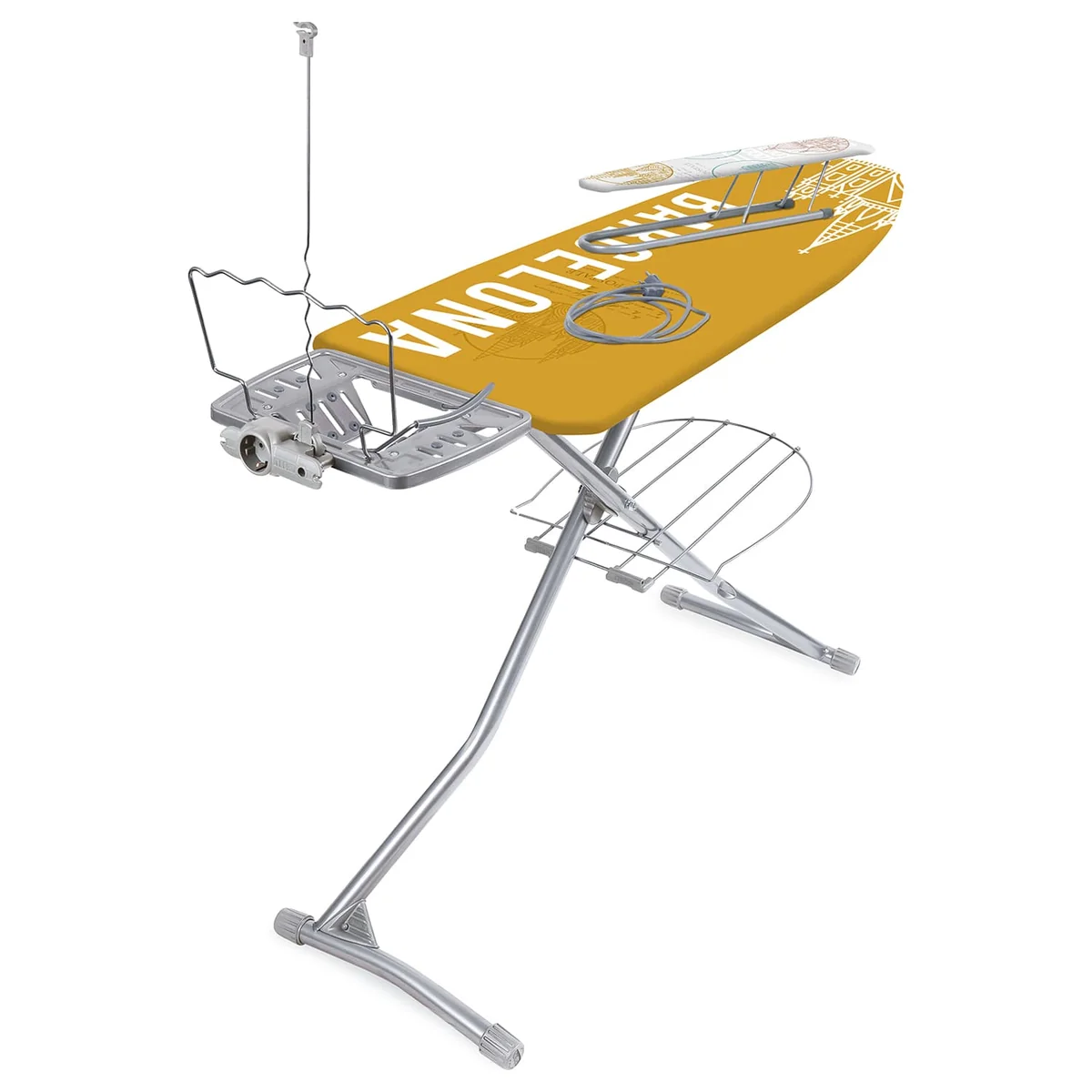 Гладильная доска с электросоединителем и подставкой под утюг, регулируемая по высоте. Удобная полка для белья и переносной подрукавник.