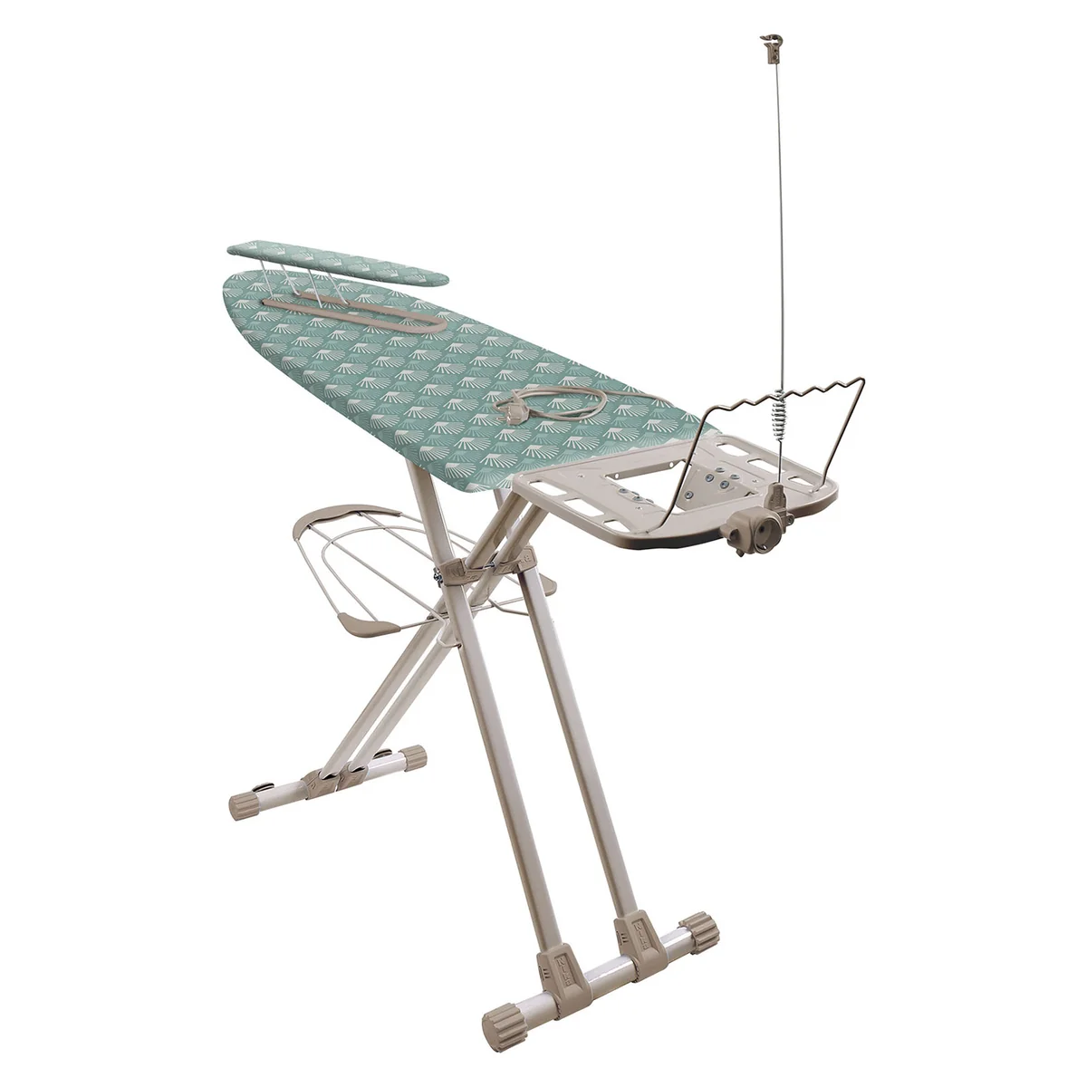 Широкая гладильная доска для использования с утюгом или парогенератором. Для удобства перемещения в изделии предусмотрены колесики на опорах.