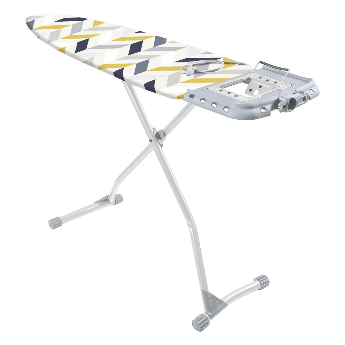 Широкая гладильная доска с электросоединителем и подставкой под утюг или парогенератор.