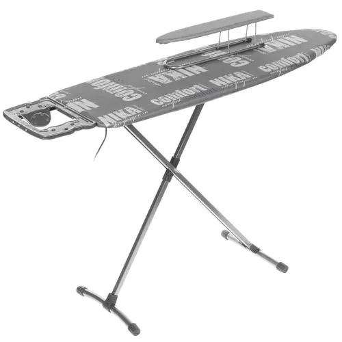 Устройство НИКА НТ10+/2 дополнено подставкой для утюга и розеткой с удлинительным кабелем. Это позволяет расположить доску в любой части комнаты, а не только вплотную к стене, что не всегда удобно. Размеры рабочей зоны составляют 40x122 см. Поставка осуществляется вместе с небольшой рукавной платформой для облегчения глажения рубашек и пиджаков.