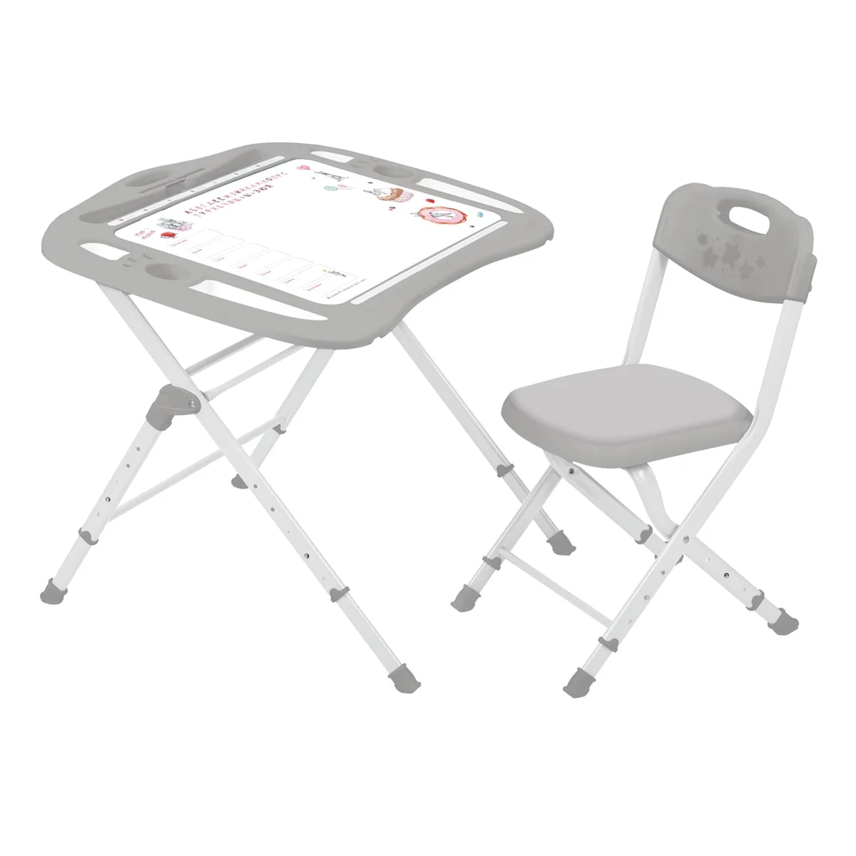 Комплект "растущей" мебели, состоящий из стола и стула, в современных цветовых решениях. Для детей в возрасте от 3 до 12 лет.