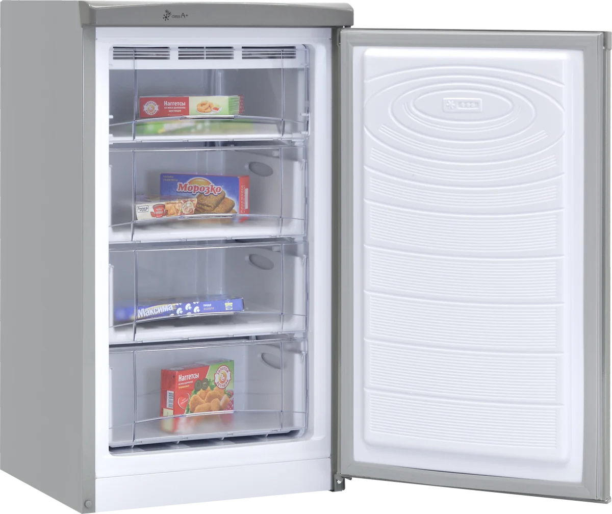 Ножки регулируются по высоте и помогут ровно выставить морозильник относительно пола. Дверь с интегрированной горизонтальной ручкой имеет возможность перенавешивания на другую сторону для комфортного открывания и установки модели в удобном месте. Корпус морозильника выполнен в серебристом цвете.