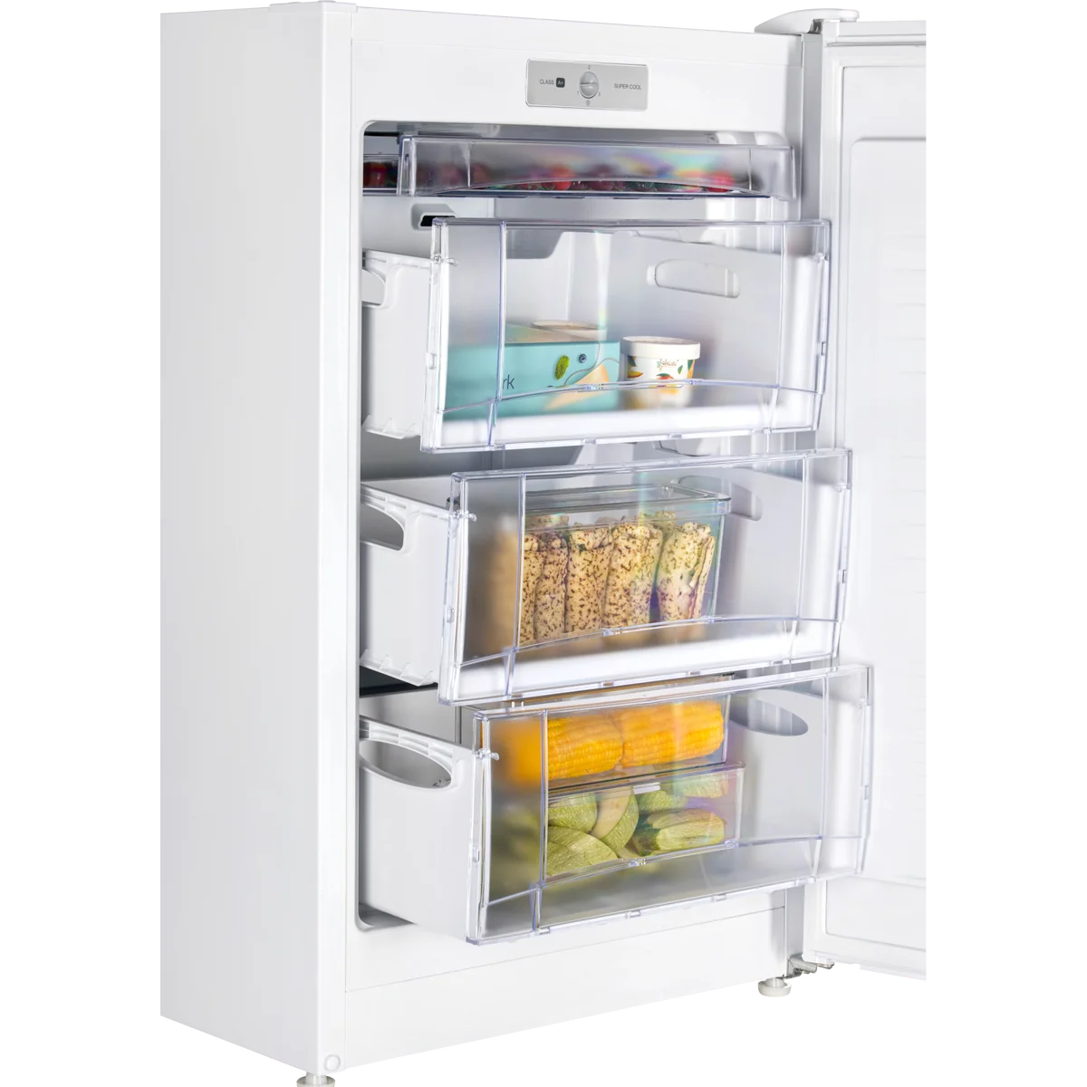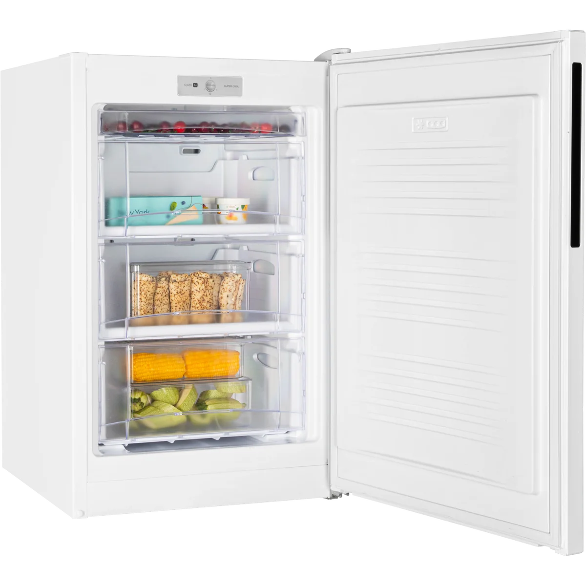 Морозильник белого цвета с черной интегрированной ручкой и продуманным внутренним пространством станет стильным и технологичным акцентом на вашей кухне. Высота устройства 93,7 см. Для комфортного открытия и установки морозильника в удобном месте — дверь можно перенавесить с правой стороны на левую.