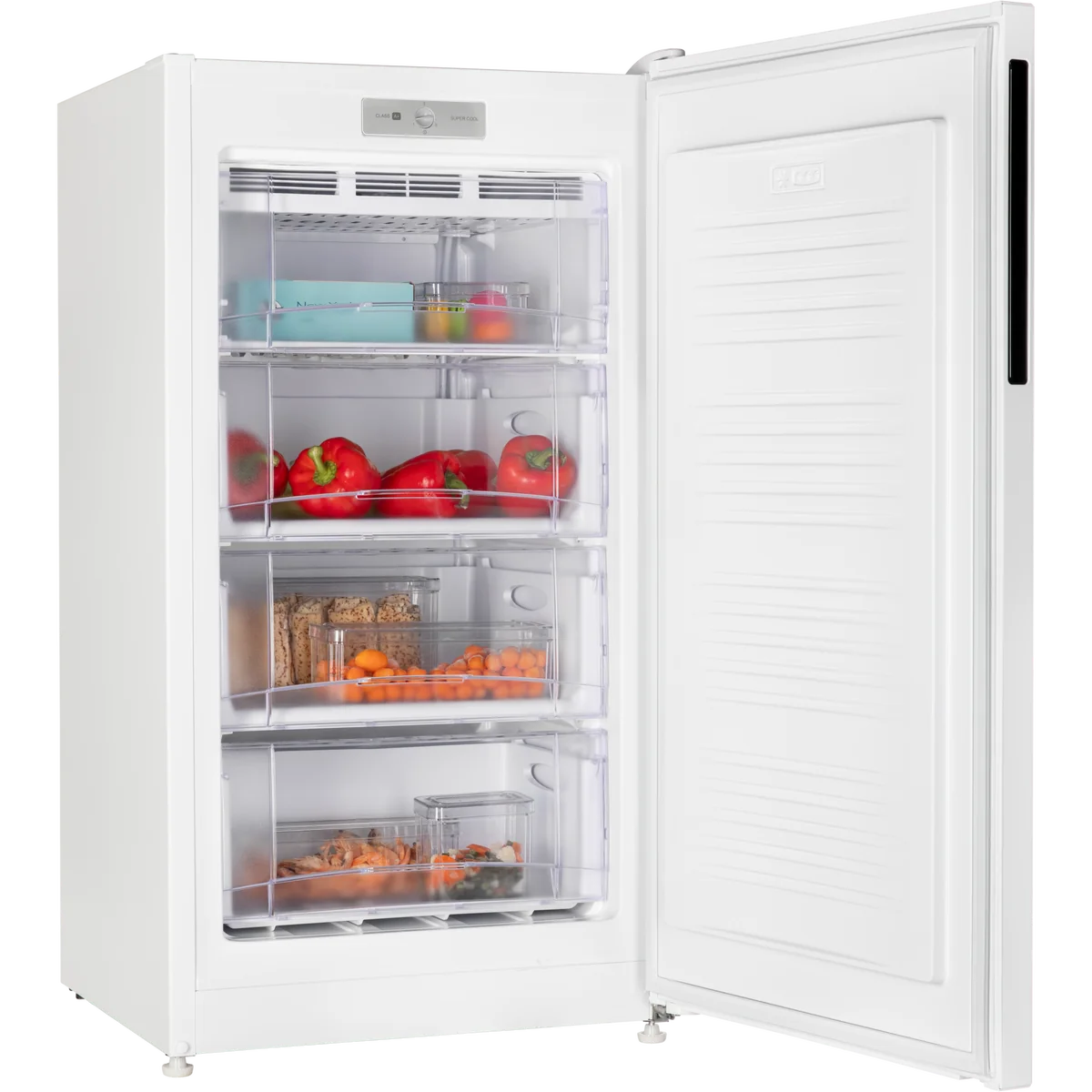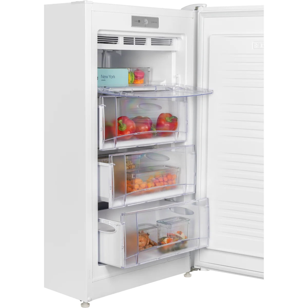 Морозильник имеет 3 выдвижных прозрачных ящика и 1 отделение с откидной шторкой для размещения продуктов, а также форму для льда. Внутренняя поверхность модели имеет антибактериальное покрытие, которое предотвращает появление неприятных запахов и образование бактерий.