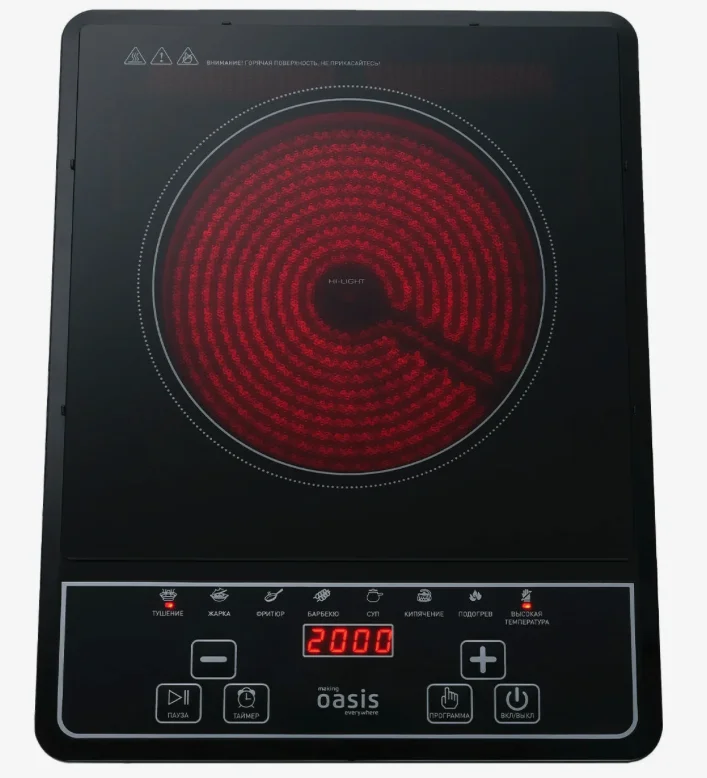- Безопасность: функция блокировки панели управления, индикатор остаточного тепла и защита от перегрева.