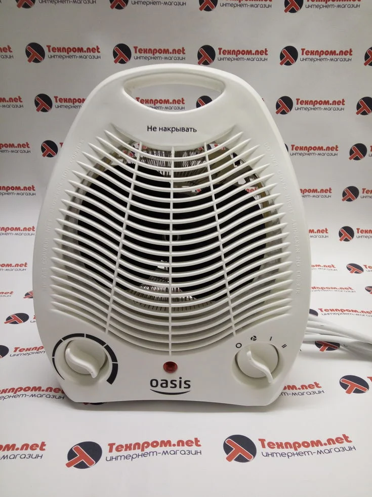 Тепловентилятор Oasis SB-20R – компактное устройство для быстрого обогрева помещения. Прибор отличается небольшим весом, для переноса предусмотрена ручка. Компактные размеры позволяют брать его в дорогу – например, для использования на даче. Тепловентилятор предполагает установку на горизонтальной поверхности и имеет два режима работы: подача холодного либо горячего воздуха. Рекомендуется использовать его в качестве дополнительного отопительного прибора. Устройство быстро обрабатывает воздух, нагревая его и распространяя по всему помещению. Принцип действия Oasis SB-20R заключается в пропуске воздушного потока с помощью вентиляционного механизма через спираль, которая выступает в качестве нагревательного элемента. Мощность энергопотребления данной модели составляет 2000 Вт, чего достаточно для обогрева помещения в 20 квадратных метров.