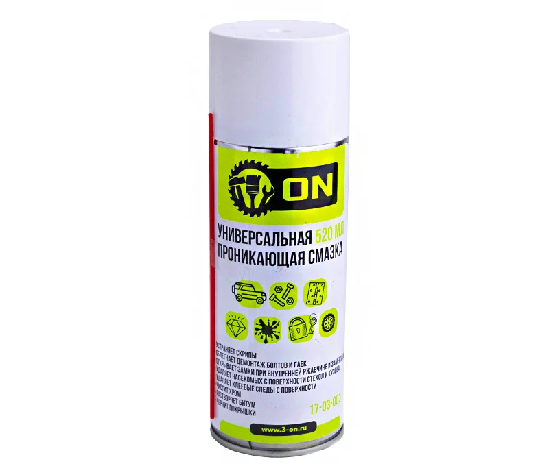 Универсальная проникающая смазка 3-ON для удобства работы выпускается в форме аэрозоля. Нашла широкое применение в быту и в профессиональном использовании. Эффективно используется при работе с резьбовыми соединениями, покрытыми застарелой ржавчиной, а также: