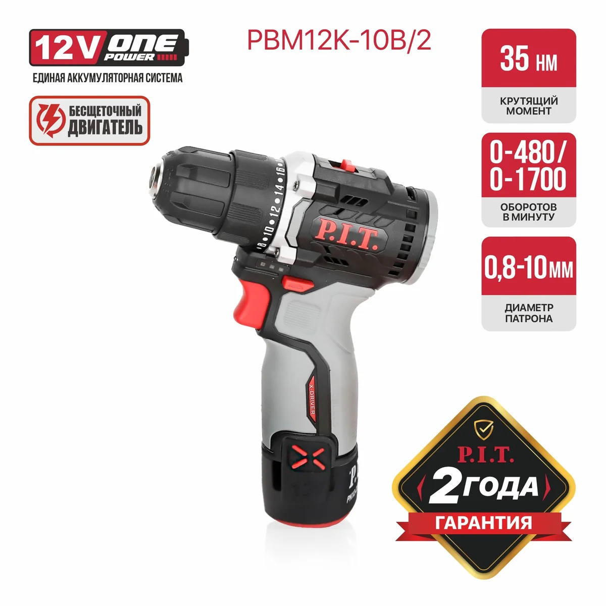 Дрель бесщеточная аккумуляторная P.I.T. PBM12K-10B/2