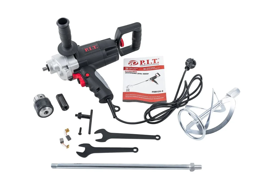 Дрель-миксер PHM120-C с ключевым патроном, в который устанавливаются сверла диаметром до 16 мм. Над кнопкой пуска располагается управление реверсом, который служит для управления вращением миксера. Так как приходится замешивать густые смеси, для лучшего удержания в руках, миксер укомплектован двумя рукоятками. Выключатель фиксируется в рабочем положении за счет клавиши блокировки, что позволяет не удерживать кнопку запуска длительное время. Дрель-миксер — надежный помощник для ремонта стройки. Миксер-дрель подходит для смешивания различных строительных материалов, в том числе красок, лаков, порошкообразных смесей, а также сверления.