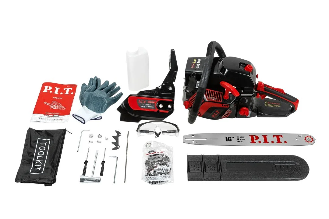 Бензопила, коробка, защитный кожух, зубчатый упор, пластиковая емкость для смешивания, ключ шестигранный- 2шт., ключ свечной, плоская отвертка, напильник круглый, руководство по эксплуатации