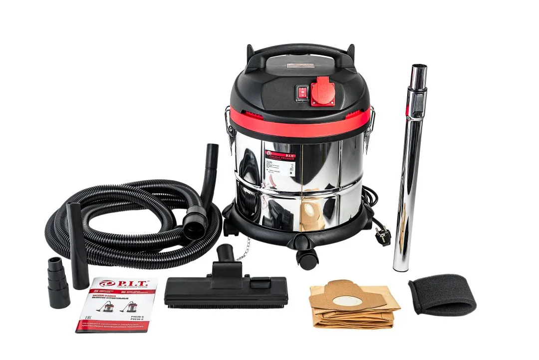 Пылесос, коробка, шланг гофрированный, насадка для сухой и влажной уборки, щелевая насадка, универсальный адаптер для электроинструмента, бумажный мешок, фильтр складчатый бумажный, фильтр поролоновый, удлинитель телескопический, ролики поворотные, руководство по эксплуатации
