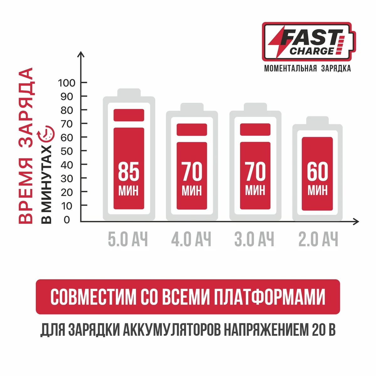 Аккумуляторная батарея 5,0 Ач - для зарядки до 100% требуется 85 минут, для зарядки до 80% - 65 минут