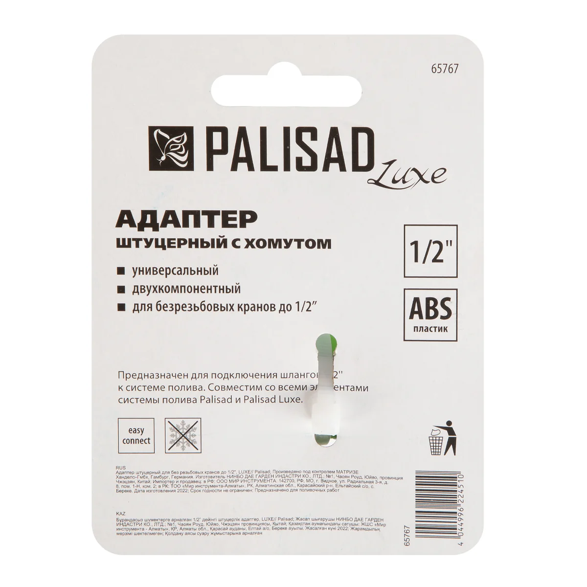 Пластиковый адаптер Palisad LUXE 65767 позволяет подключить поливочную линию к трубе, отводу или безрезьбовому крану диаметром 1/2"". Используется для организации системы полива на загородном участке.ПреимуществаВысокий ресурс и долговечность — адаптер выполнен из прочного ABS-пластика, устойчивого к воздействию влаги и солнечного света.Фиксация при помощи хомута — адаптер удобен для подключения к кранам, не имеющим резьбы.Простой монтаж поливочной системы — штуцер быстросъемного соединения обеспечивает мгновенное подключение и отключение шланга.