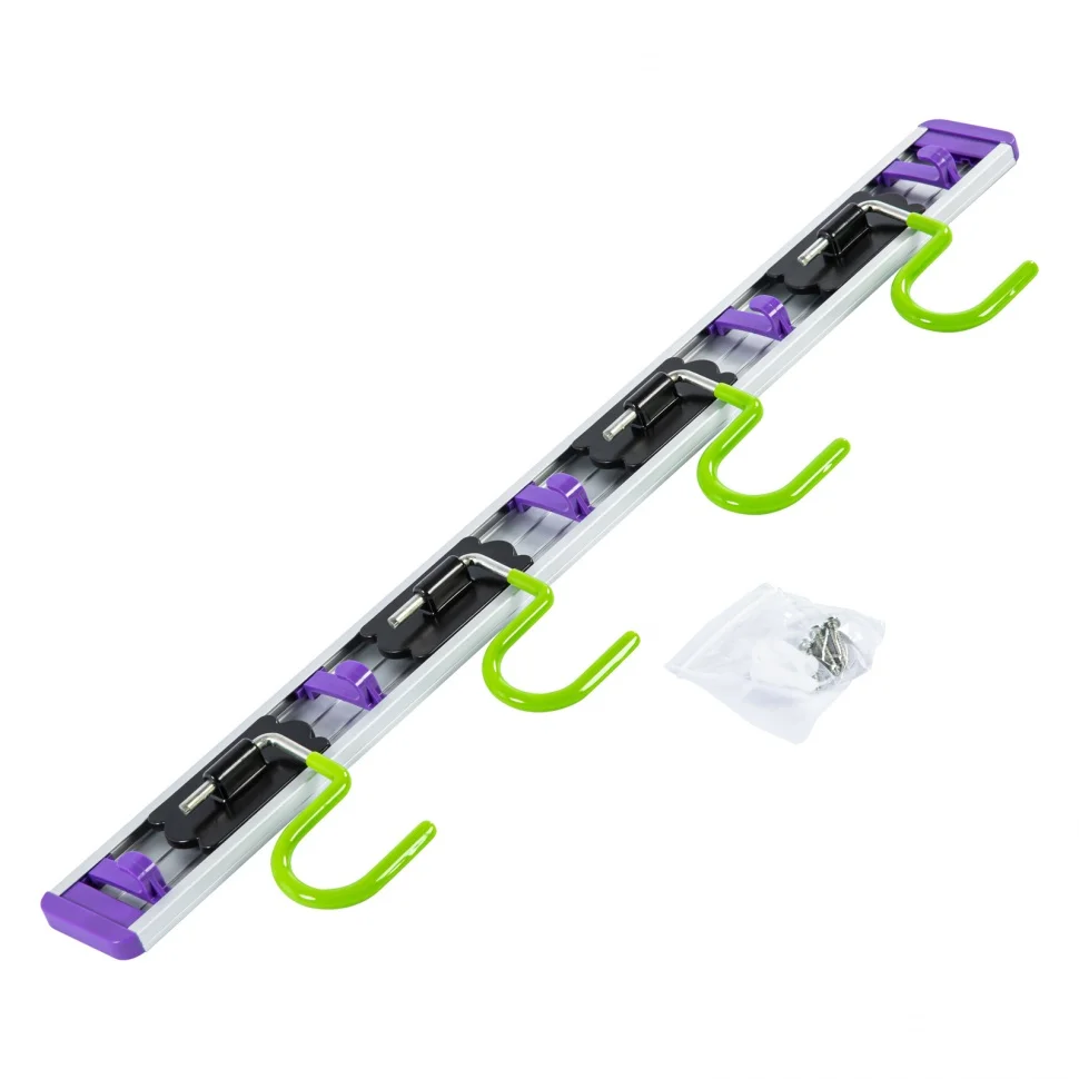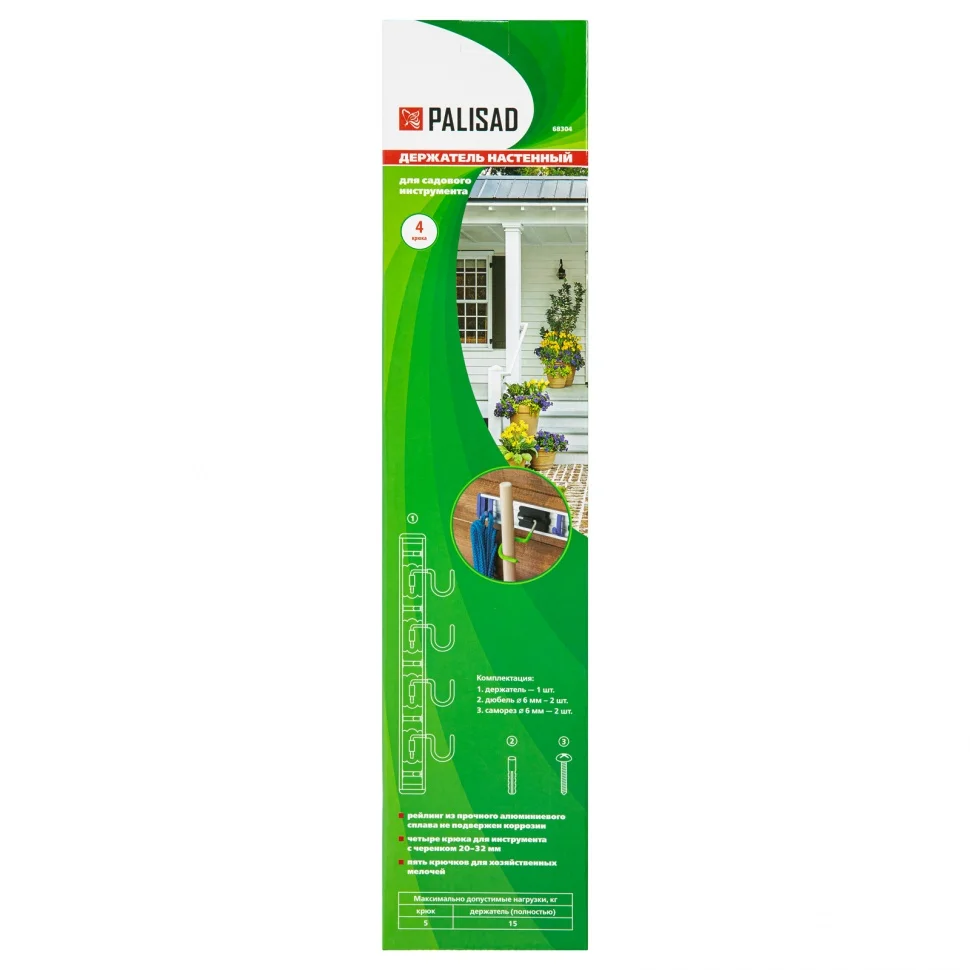 Алюминиевый настенный держатель Palisad 68304 с 4 основными и 5 дополнительными крюками позволяет удобно хранить садовые инструменты в подвешенном виде. Благодаря ему можно сэкономить рабочее пространство и практично разместить инвентарь. Инструменты на держателе не будут мешаться под рукой, не потеряются и не сломаются. На нем можно разместить любой инвентарь не только с обычным черенком, но и с отверстием для подвесного хранения: швабры, веревки и т.д. Пригодится в быту и на даче.ПреимуществаНаправляющая из алюминия обеспечивает надежное удержание крюков.Фиксация предметов осуществляется простым способом «сверху-вниз», поэтому держатель удобно использовать.4 основных крюка и 5 дополнительных крючков позволяют хранить большое количество предметов.Боковые заглушки исключают выпадение крюков и поломку инструментов.Алюминиевый держатель выдерживает нагрузки до 15 кг, крючки — до 3 кг каждый.Набор крепежа поставляется вместе с держателем, поэтому его не придется покупать отдельно.